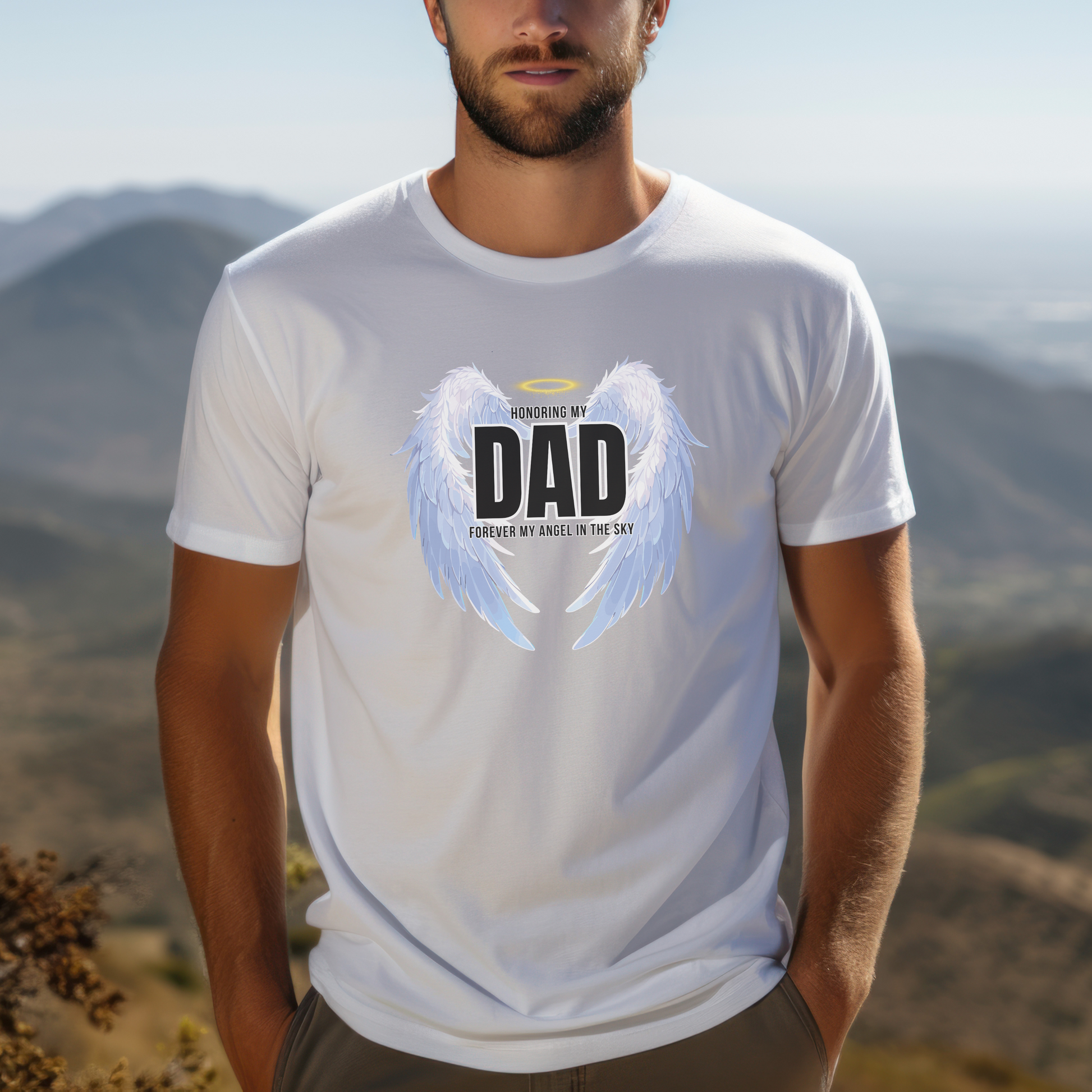 Honor your Dad's memory with our Beautiful Dedication Graphic Tee. "Honoring My Dad, Forever My Angel In The Sky." Featuring a graceful angel wing design, this shirt offers comfort and a heartfelt tribute to your Beautiful Angel.