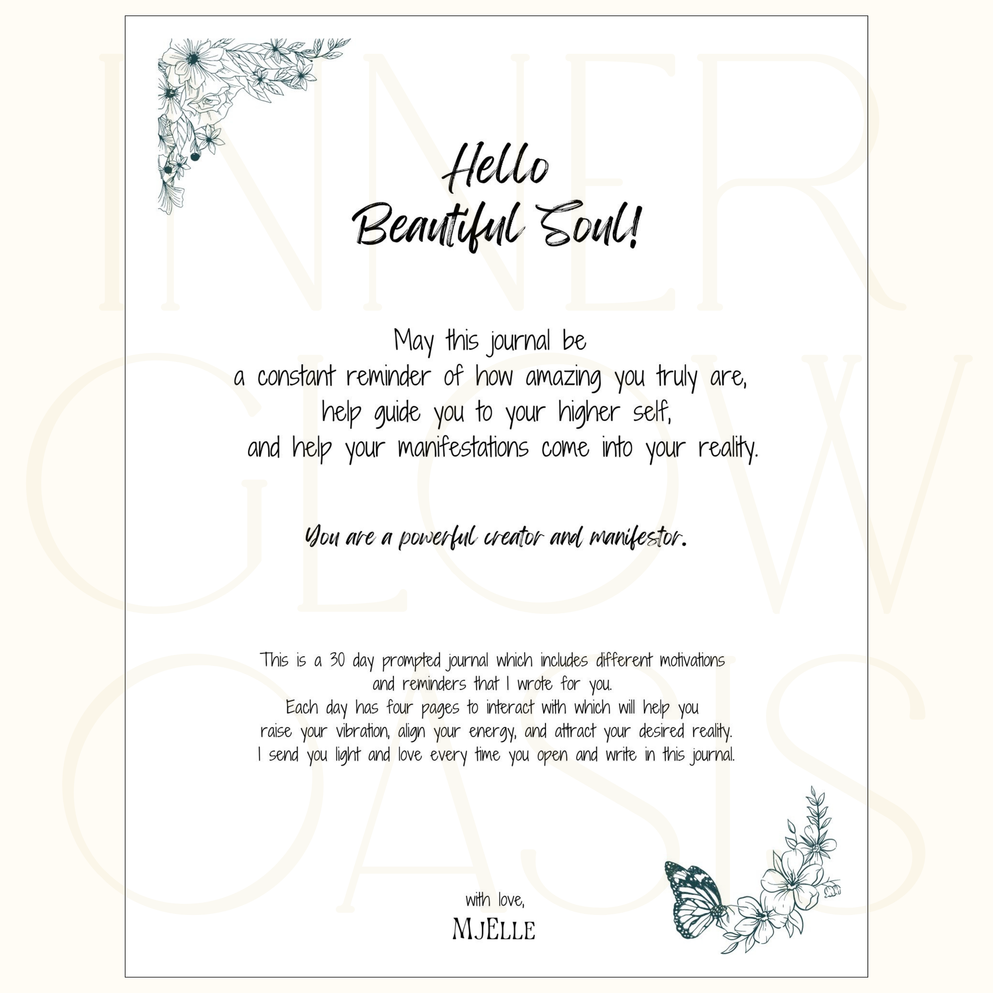 THIS JOURNAL contains prompt pages that help raise your vibration, align your energy, and manifest beautiful things into your reality. It includes different motivations and positive reminders to help you through your journey. It is the perfect beginning stage to understanding and seeing how you can truly create your desired reality.