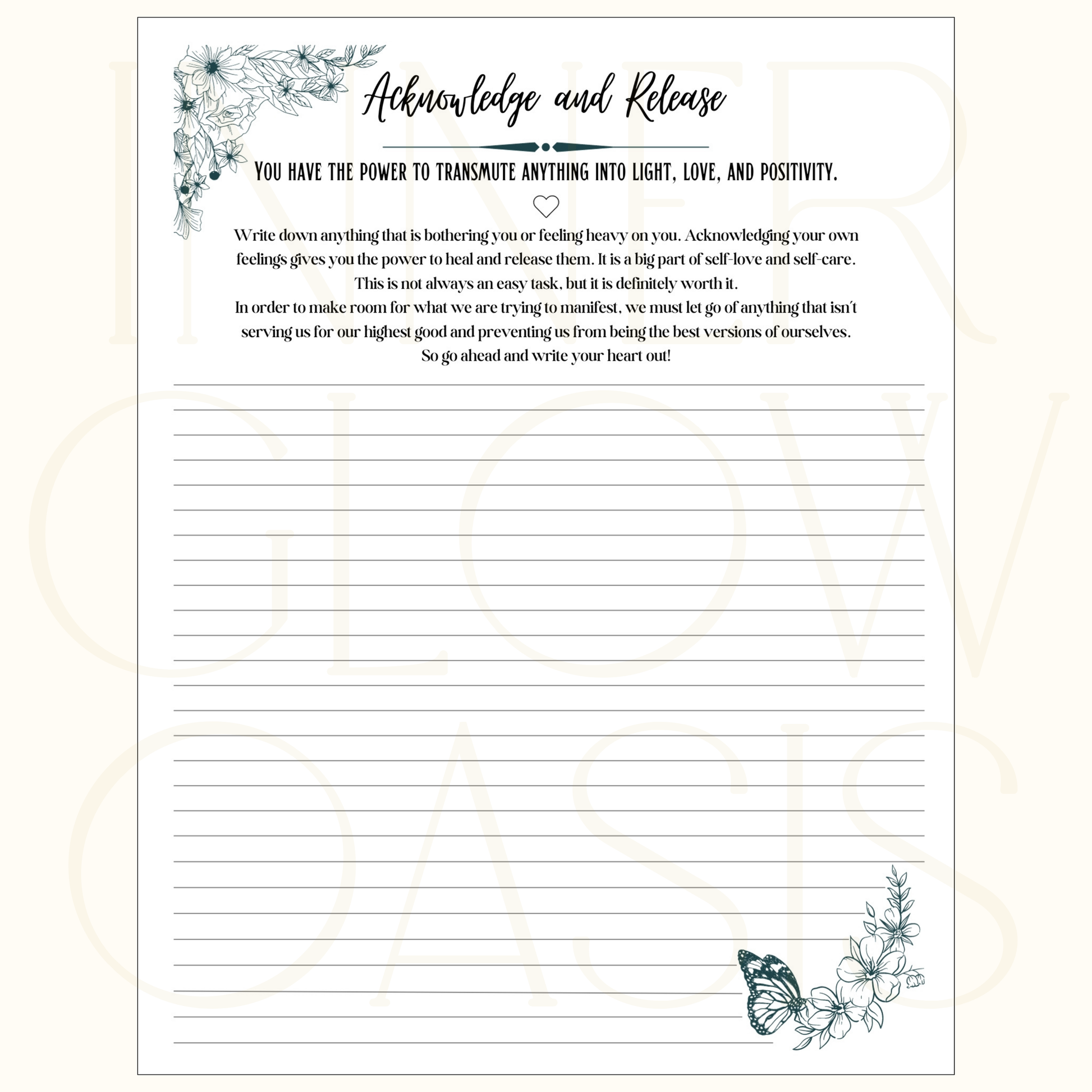 - Acknowledge & Release pages are available for you to write down anything that is currently occupying your mind/energy so you can heal and release it. Any limiting beliefs or unworthy thoughts about yourself can be written and released on these pages.